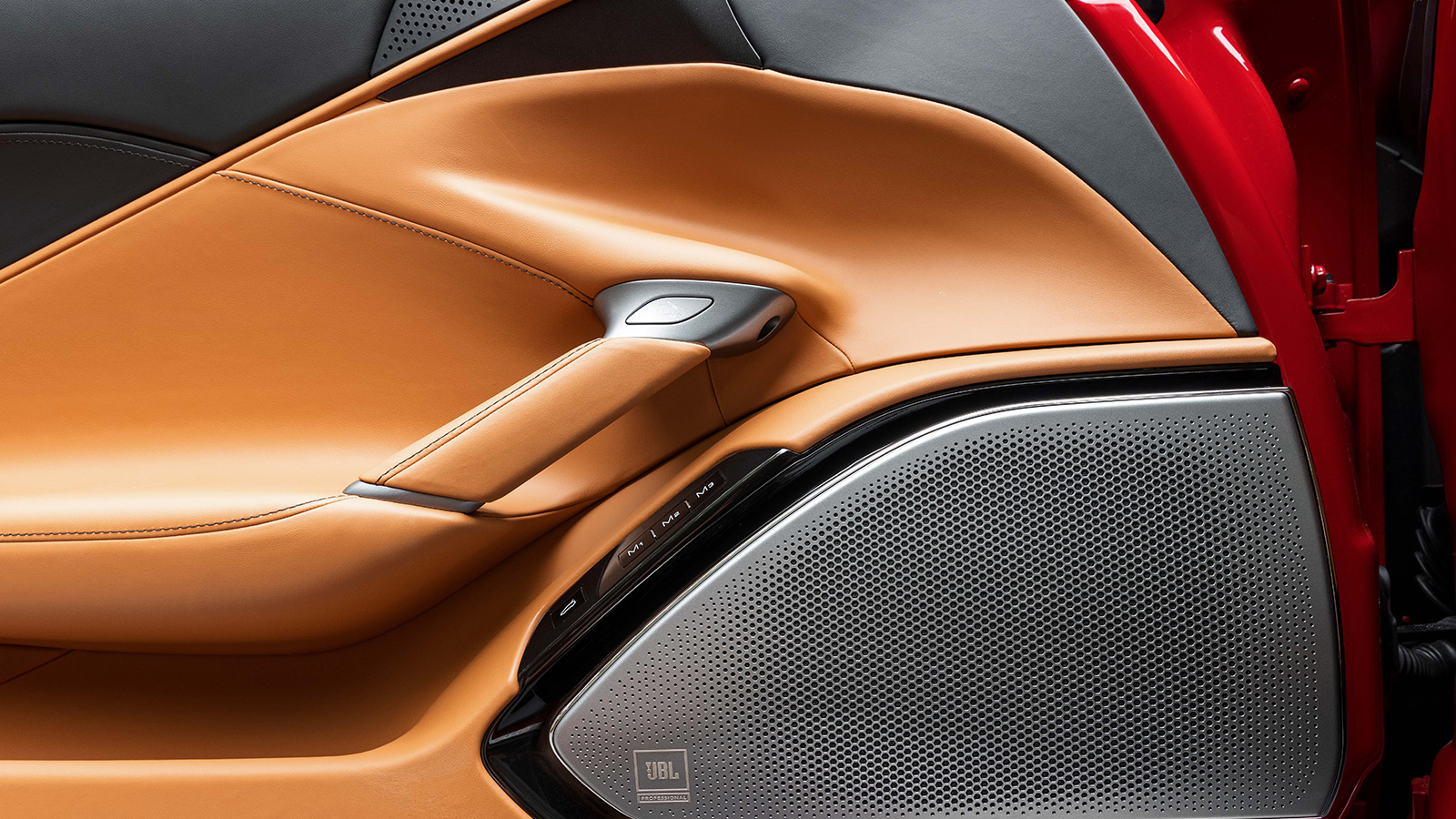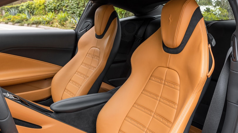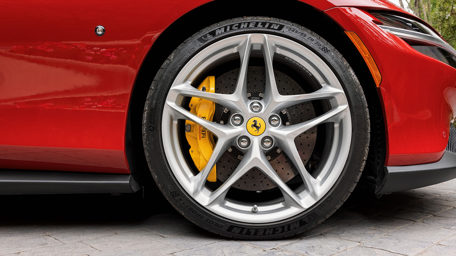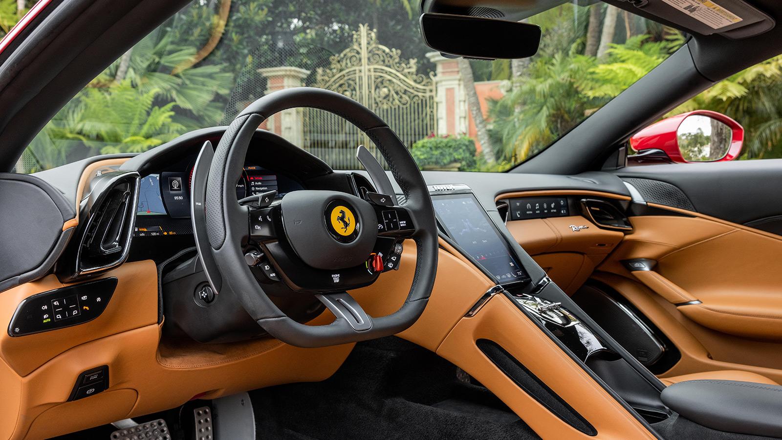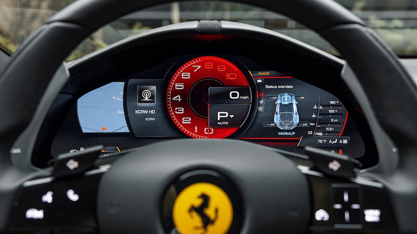 - Special Features: high-tech steering wheel with touch startup sequence, drive mode selector and more; 16” digital dash with multiple screens and drive modes; 8.4” vertical center infotainment screen; Dual Cockpit with passenger display; ‘Scuderia Ferrari’ shields (Yellow Ferrari logos on fenders), 20” five-star wheels, carbon ceramic brakes with Yellow brake calipers, trunk plaque with specific car details listed